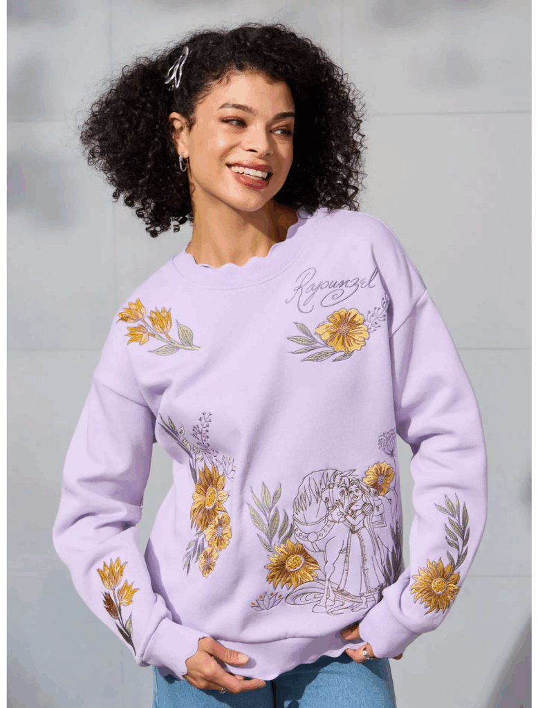 Check out more details about this unisex style: “With embroidered details and scalloped edges, this crewneck features Rapunzel and Maximus amid flowers and her signature.”