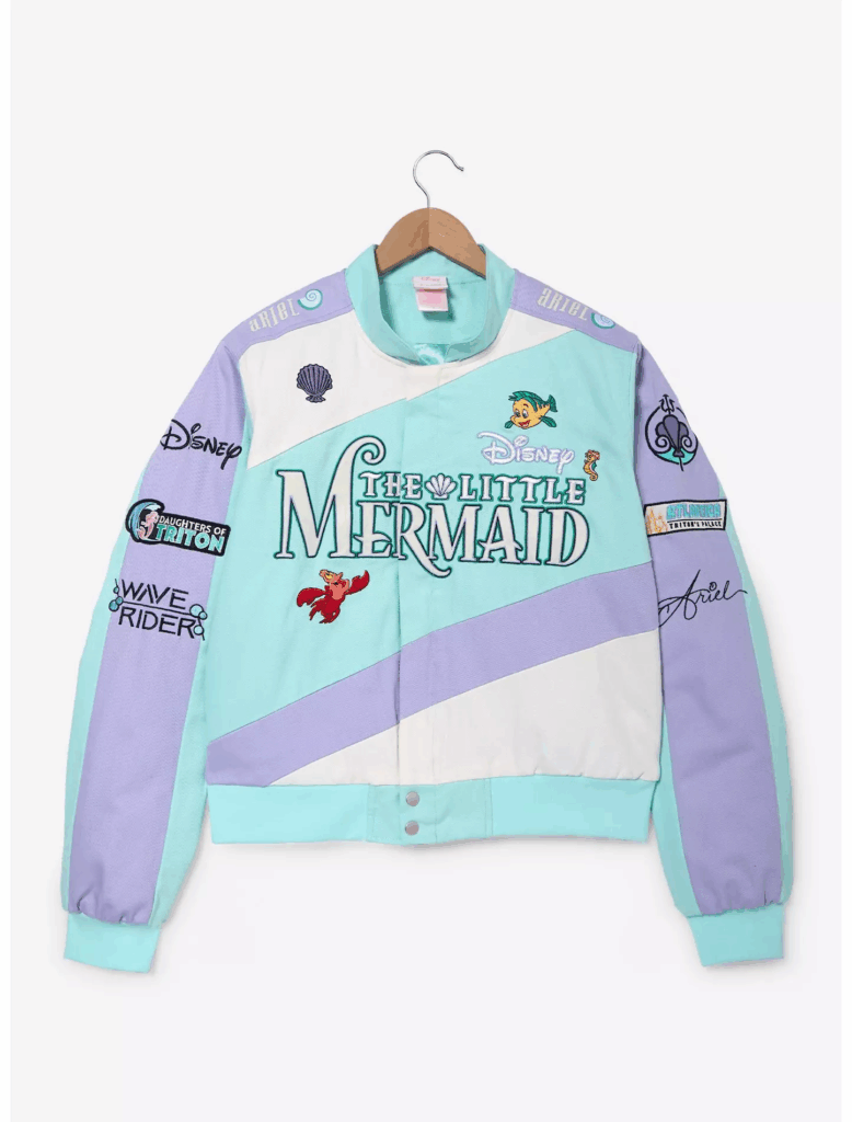 BoxLunch describes the jacket: “Embroidered with The Little Mermaid and Ariel details, this cropped racing jacket includes satin quilted interior and a zipper and snap closure.”
