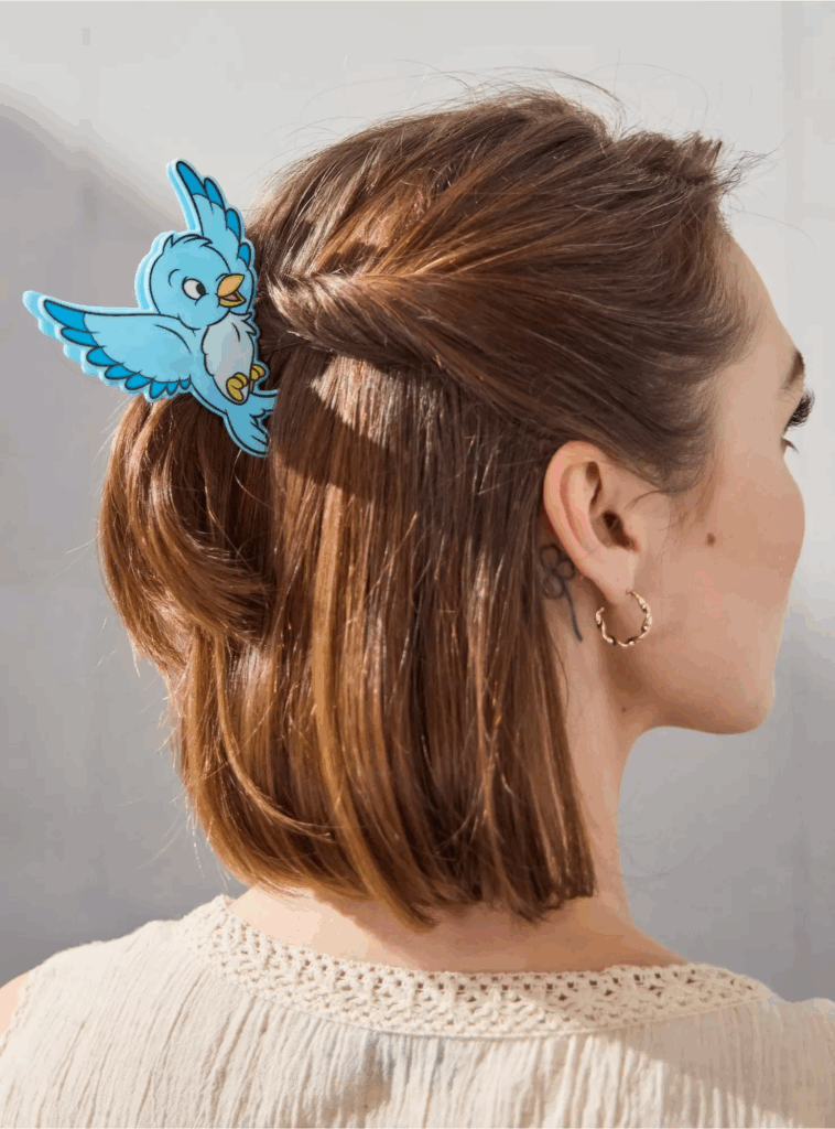 Hear more about our charming friend: “Designed to hold a medium amount of hair, this claw clip is fashioned into one of Cinderella’s bird friends. A BoxLunch Exclusive!”