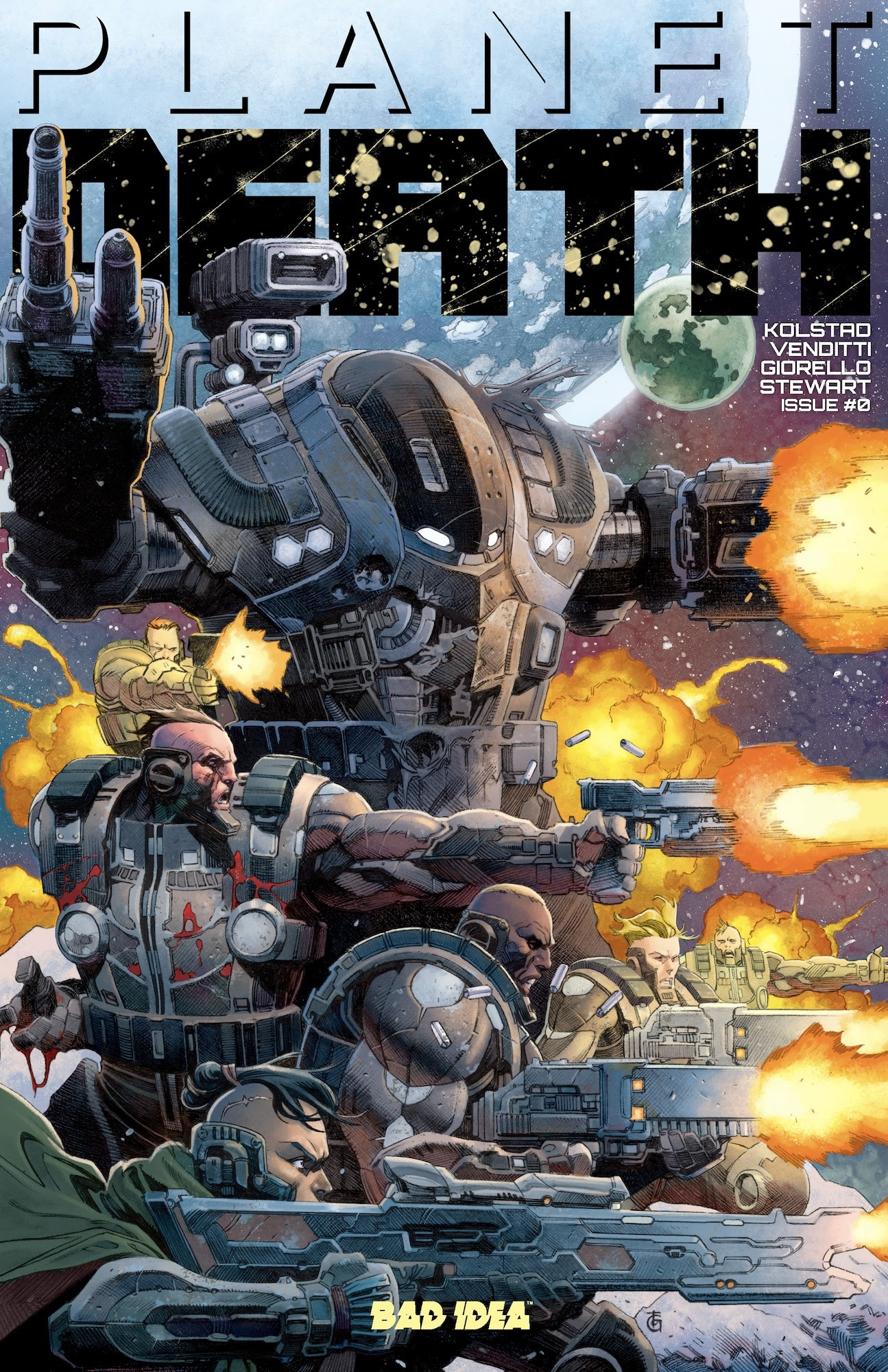 This week, Bad Idea’s PLANET DEATH hits local comic shops, and you are going to want to grab a copy. Created by blockbuster screenwriter Derek Kolstad (JOHN WICK motion picture franchise), New York Times best-selling writer Robert Venditti (SUPERMAN ‘78, GREEN LANTERN), visionary artist Tomás Giorello (STAR WARS, CONAN), and ten-time Eisner Award-winner Dave Stewart; this massive sci-fi comic book event starts with PLANET DEATH #0 that will get you ready for the 40-page prestige format PLANET DEATH #1 heading our way this July.