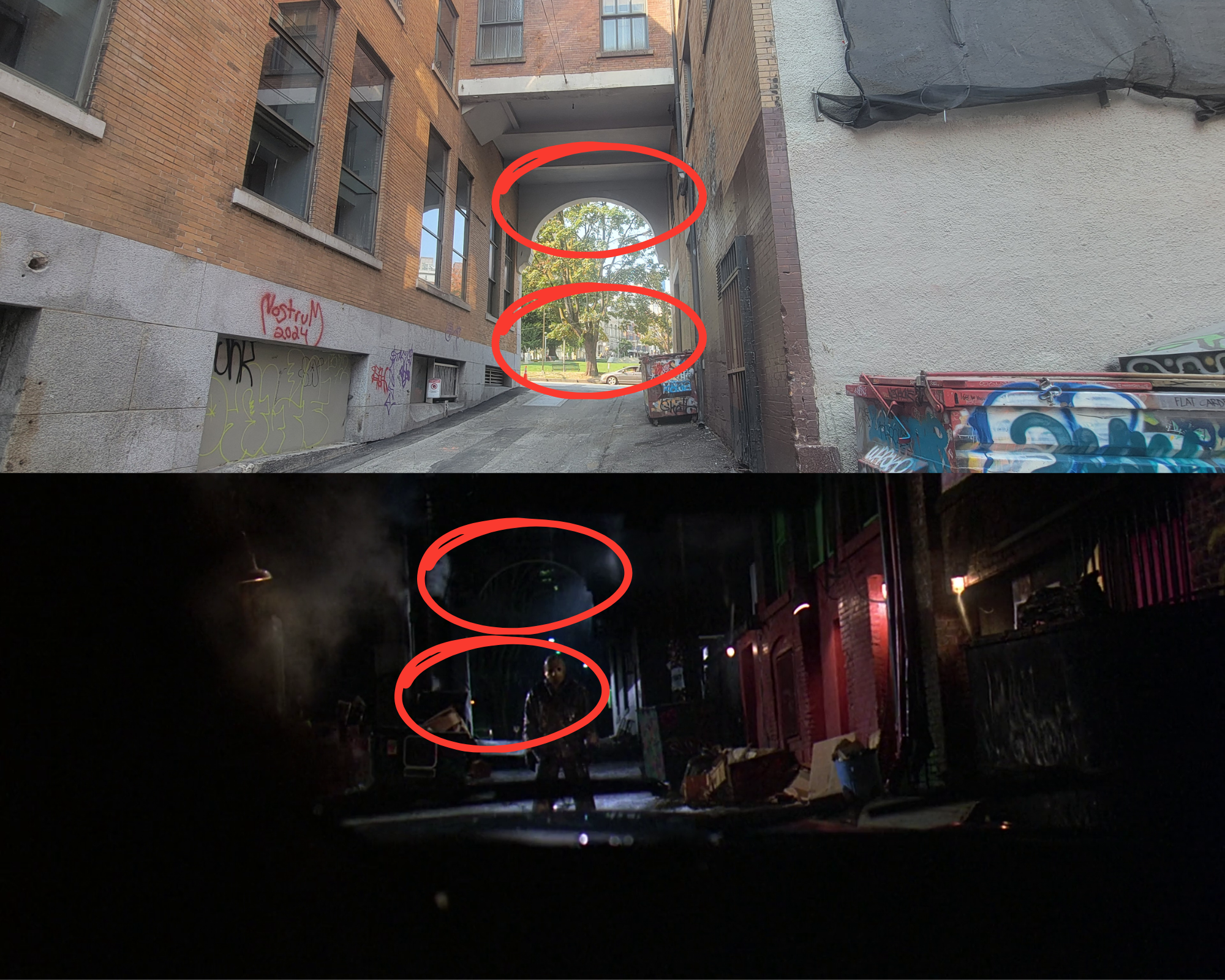 In that very same alley, there was an empty loft that now has some construction. We know it to be where they filmed young Jason as Rennie and Colleen barrels towards him and crash into a barrier; where Colleen meets a fiery death.