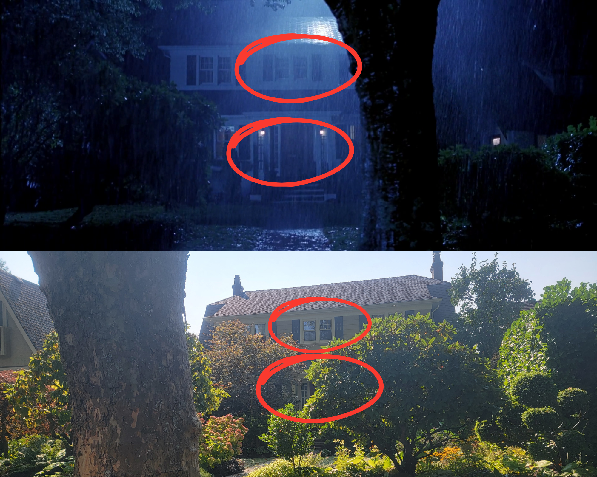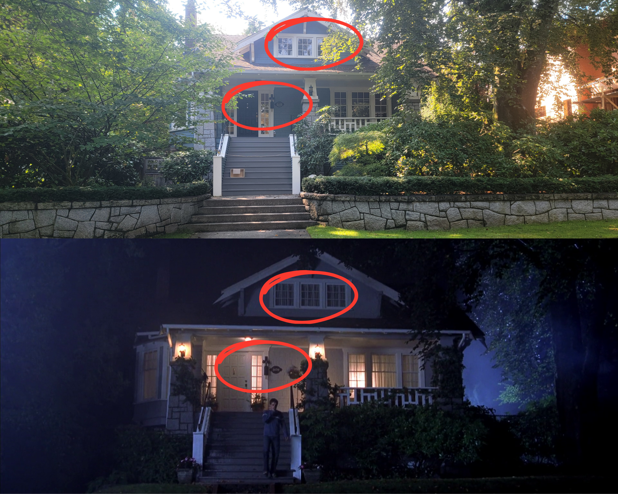 Likewise, we later see Blake’s house and it’s an actual house. Located at 2170 W 35th Ave, Vancouver, BC. Like the previous house, the owners have a lot more shrubbery around but you can clearly make out the many of the similarities. Just a couple are the windows on the upper level and the door which keeps the address sign and bell to the side of the door.