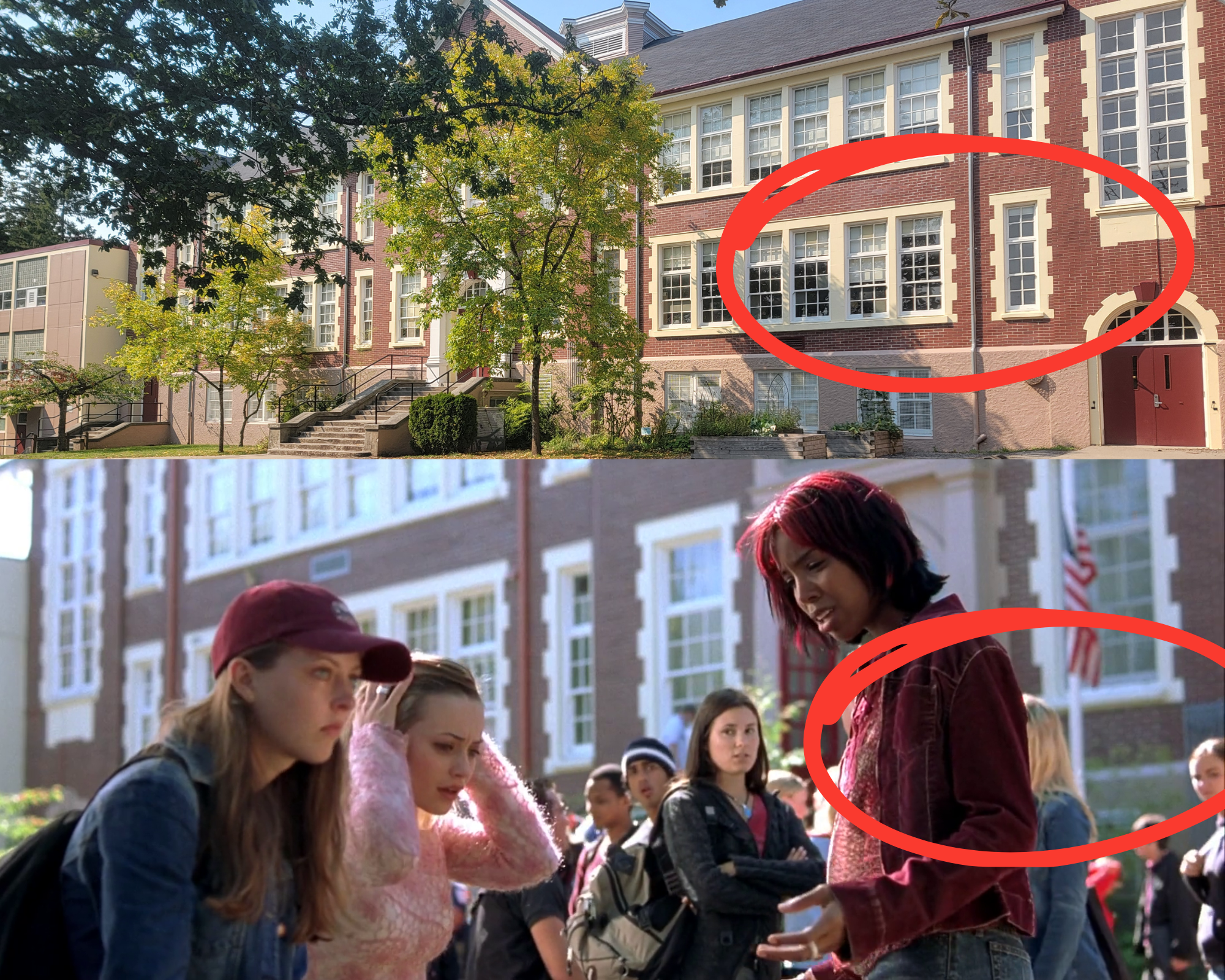 Next up, the school that the teens go to is an actual school, Kerrisdale Elementary School (5555 Carnarvon St). The school is visually practically the same. With the window frames, bricks, and the lower beige component the same. No American flag, but this is in Canada after all.
