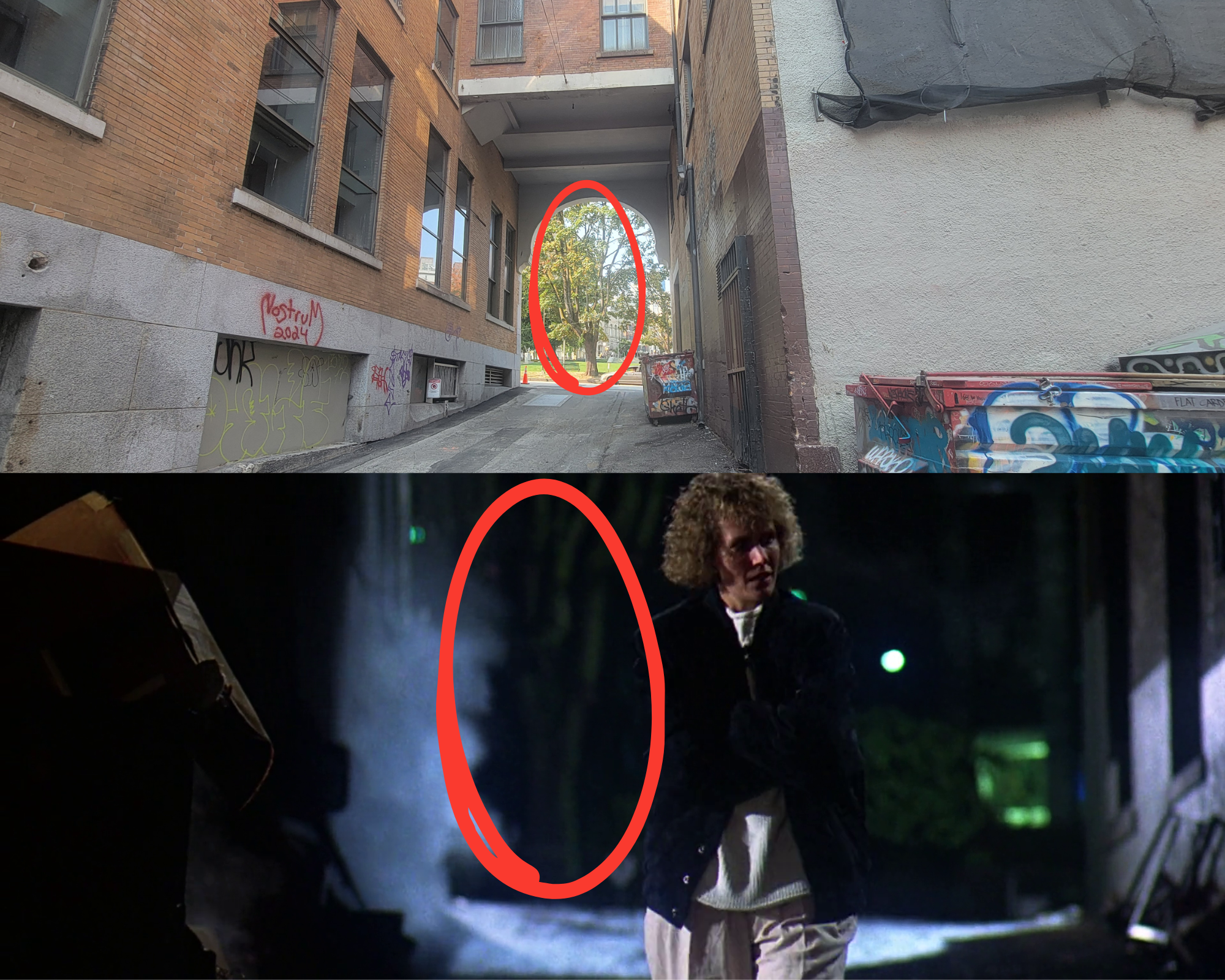 They also filmed Colleen walking down this same alley before she gets spooked by police officers. You can see the tree more clearly in the closeup.