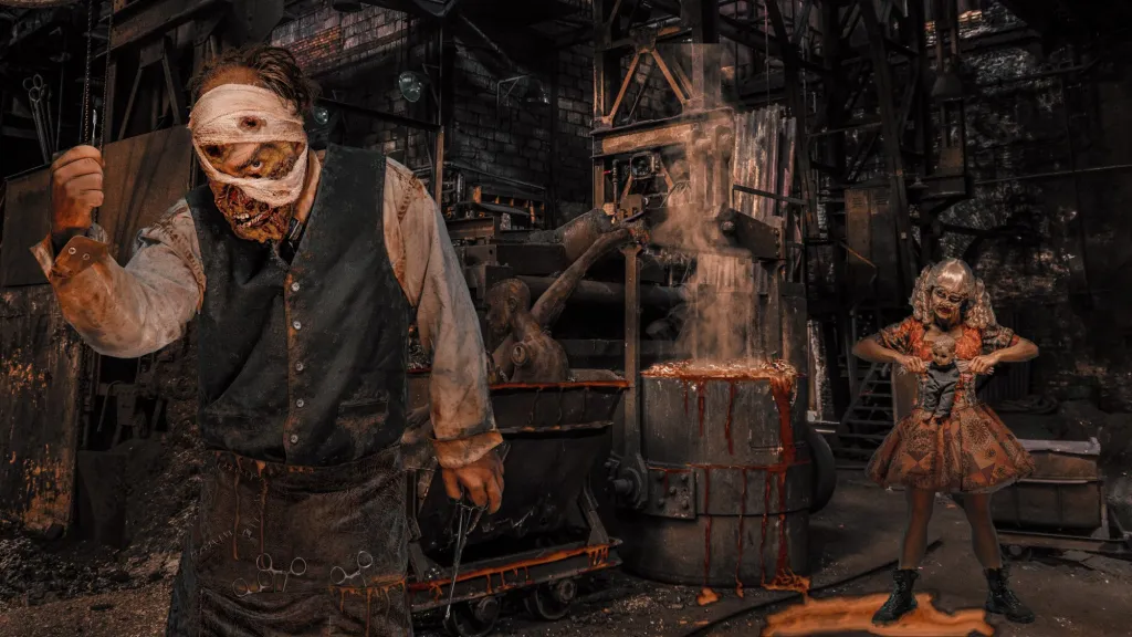 Take a dash of The Black Dahlia, add in some prohibition theming, and even some of The Stuff, and you get Room 13. This maze doesn’t even have a full on sign, it’s that hidden in prohibition-era theming. The story here takes you through a dilapidated hotel called the Argive Hotel. This has some of the best scares in the park with bellhops, guests, and other monsters taking aim at your as you walk through. It also has one of the best set pieces set on scaffolding on the side of the building with a nice illusion to make it look like you’re 30 stories up. The finale takes you into the basement of the building where you finally figure out where the dangerous cocktail The Devil’s Elixir comes from. It’s a shame that they don’t sell a themed cocktail to tie in with this maze.
