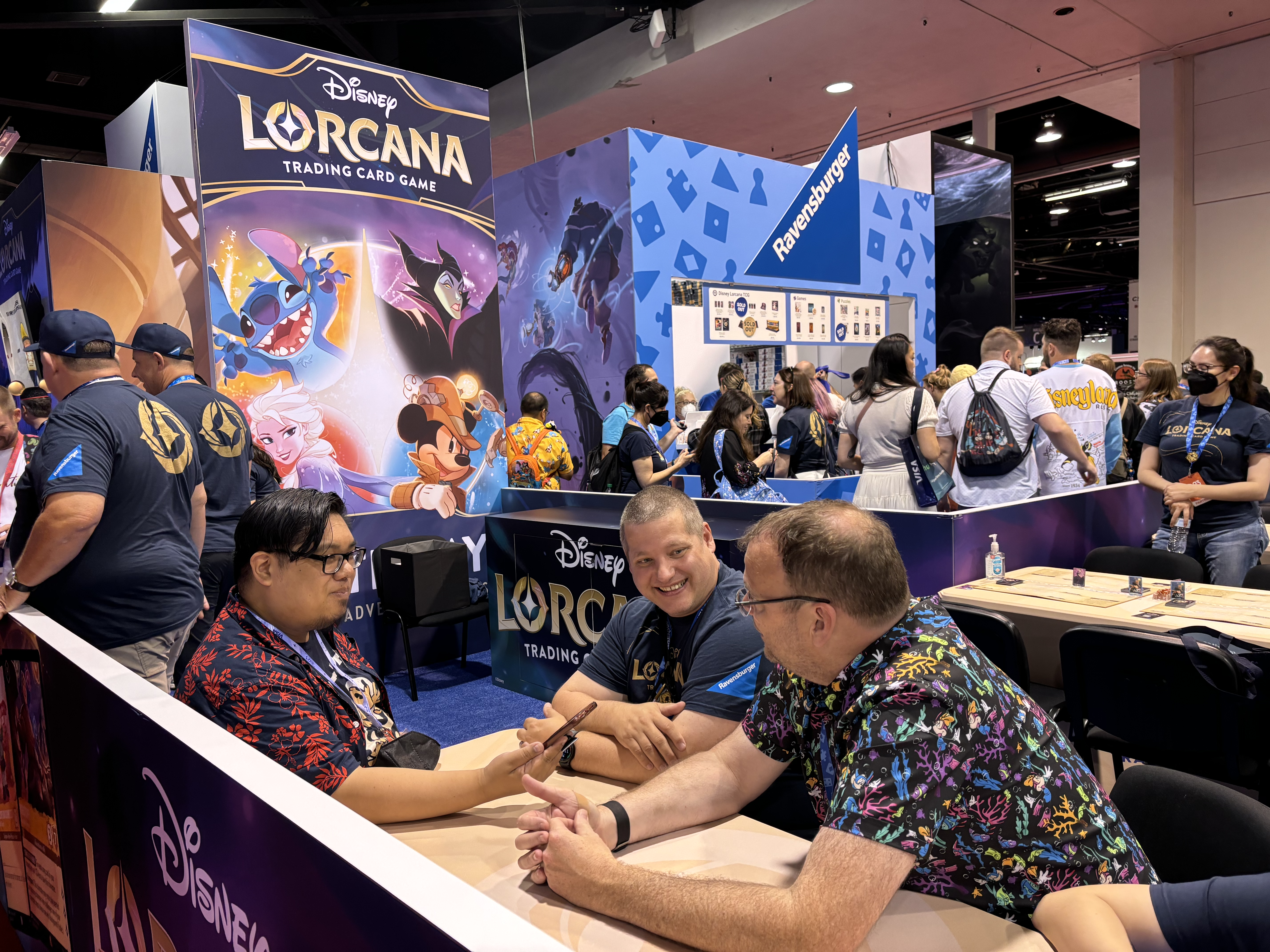 On August 18, 2024, Illumineers around the world celebrated the first anniversary of Disney Lorcana, the first trading card game from European game makers Ravensburger. While that was the day that the inaugural set dubbed “The First Chapter” hit specialty stores (followed by the wide release at major retailers on September 1), the public got their first taste of the game at the 2022 D23 Expo. So naturally, when the 2024 edition of the Ultimate Fan Event rolled around, the whole Lorcana team came out in full force to celebrate, including the game’s co-creators Ryan Miller and Steve Warner.